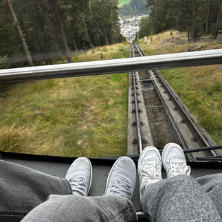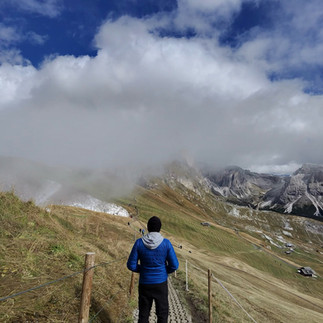 Nosso primeiro dia nas montanhas foi no Monte Resciesa (Resciesa/Resciessa). Subimos de funicular e, lá em cima, o clima muda: o ar fica mais fresco, o silêncio aumenta e o mundo parece desacelerar.